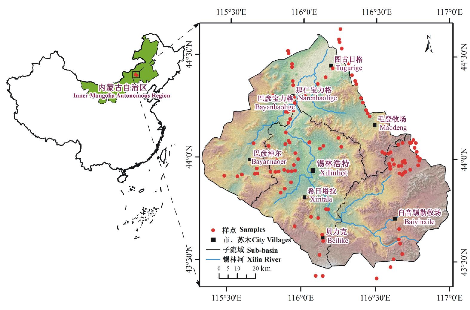 锡林河流域地处内蒙古高原东部(43° 26'-44° 39' N, 115° 32'-117° 12' E), 流域总面积约9786 km2(图1)[19]。流域地势东南高西北低, 东南部锡林河上游, 最高处海拔为1505.6 m, 西北部锡林河下游, 最低处为902 m。本区气候属于大陆性温带半干旱气候, 夏季较为暖湿, 冬季寒冷干燥。年平均气温0℃左右, 年平均降水量约350 mm, 主要集中于6-8月[20]。本区土壤类型由东南向西北呈现出有规律的更替分布, 即黑钙土带-暗栗钙土亚带-淡栗钙土亚带[20, 21]。流域内植被以典型草原为主, 约占植被总面积的78%, 草甸草原也有分布。从空间上看, 锡林河上游主要为贝加尔针茅(Stipa baicalensis)草原和线叶菊(Filifolium sibiricum)草原, 中游为羊草(Leymus chinensis)草原和大针茅(S. grandis)草原, 下游为克氏针茅(S. krylovii)草原和冷蒿(Artemisia frigida)草原。此外, 境内还有沙地的分布[19, 22]。