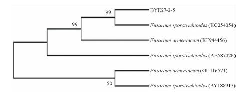 根据病原菌的培养形状、两型分生孢子和厚垣孢子的形态特征, 结合相关资料[18, 19, 20], 初步确定BYE27-2-5为拟枝孢镰刀菌 (Fusarium sporotrichioides)。