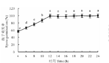 (1)分生孢子萌发时间的测定, 将分生孢子配制成浓度为10~20个孢子/视野(10× 40倍)悬浮液, 采用凹载片萌发法, 25℃保湿培养, 分别于4~24 h(间隔2 h)后检查300个孢子萌发情况, 确定最佳萌发时间。