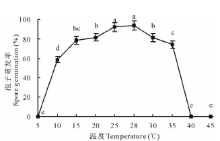 孢子萌发的温度范围为10~35℃, 最适温度为28℃, 12 h后孢子萌发率为93.80%, 在5~28℃之间, 孢子萌发率随着温度的升高而增高, 在28~40℃之间, 孢子萌发率随着温度的升高而降低(图11)。