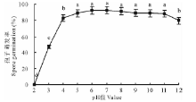 在pH为3.0~12.0范围内孢子均可萌发, 最适pH为7.0, 12 h后孢子萌发率为92.56%, 不同pH值对孢子萌发的影响差异显著(图12)。