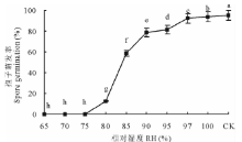 (5)湿度对分生孢子萌发影响测定, 将孢子悬浮液滴于凹载片上, 风干后置于用不同盐类饱和溶液控制的湿度为65%, 70%, 75%, 80%, 85%, 90%, 95%, 97%, 100%以及水滴等不同湿度的密闭容器中。其他同方法1.5.2(2)。