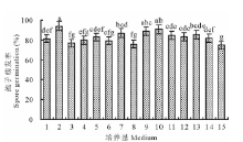 14种不同培养液对分生孢子萌发都有一定的促进作用, 其中葡萄糖蛋白胨培养液、CA、真菌生理培养液能有效地促进孢子萌发, 葡萄糖蛋白胨培养液中孢子萌发率为93.99%, CK为75.76%(图15)。