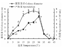 菌丝生长和产孢的温度范围均为5~35℃, 菌丝生长最适温度为25℃, 5 d菌落直径为7.44 cm, 最适产孢温度为30℃, 7 d产孢量为5.93× 105个/mL, 低于5℃或高于35℃菌丝不生长也不产孢(图6)。
