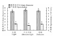 光照处理对菌株菌丝生长和产孢无显著影响。黑暗和光照下, 菌丝的生长和产孢的差异不明显, 但光暗交替更利于菌丝的生长, 5 d菌落直径为7.15 cm, 但不宜产孢(图8)。
