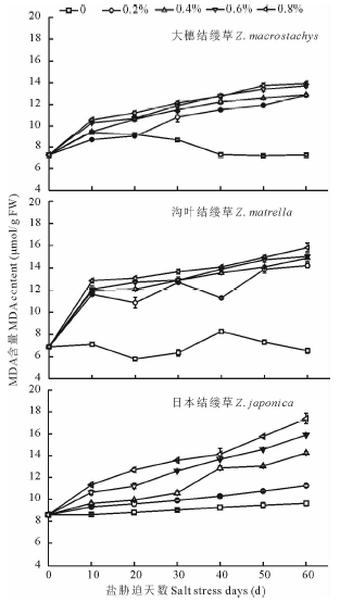 不同盐浓度处理下3种结缕草叶片MDA变化