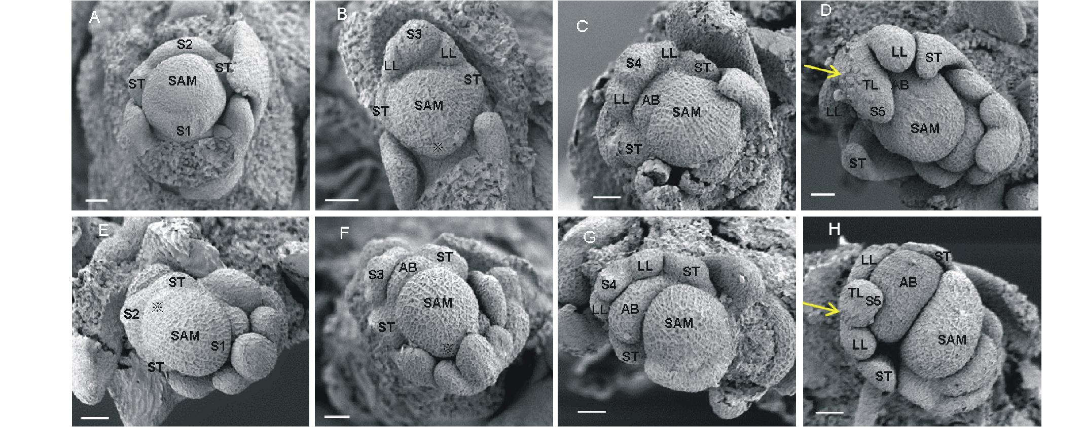 叶元发生过程的扫描电镜观察:取2.5%戊二醛固定2 h后的芽, 切取顶端1~2 cm, 放在铺有滤纸的培养皿中, 滤纸提前用PBS缓冲液浸湿, 然后在解剖镜下轻轻剥离幼叶直至芽露出生长锥, 立即移入培养皿内用0.1 mmol/L的PBS冲洗3次, 每次15 min; 然后依次用30%, 50%, 70%, 85%, 95%和100%的乙醇脱水, 每次15~20 min, 其中100%乙醇置换2次; 用1∶ 1的乙醇∶ 叔丁醇溶液置换30 min, 再用100%叔丁醇置换2次, 每次30 min; 将置换后的芽置于4℃ 冰箱中预冷, 然后放入VFD-21S冷冻干燥仪中进行干燥。待样品干燥后, 用碳导电胶粘到样品台上, 在MSP-2S 型磁控离子溅射仪上喷金90 s。最后用日立S-3400N扫描电镜(scanning electron microscope, SEM)进行观察、拍照。