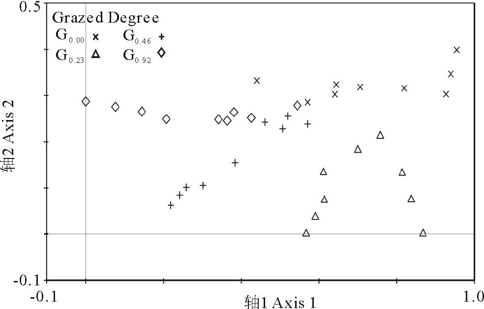 | 图2 不同放牧梯度下土壤微生物群落PLFA的除趋势对应分析Fig.2 Detrended correspondence analysis of PLFA profiles from soil microbialcommunities of different grazed degrees |