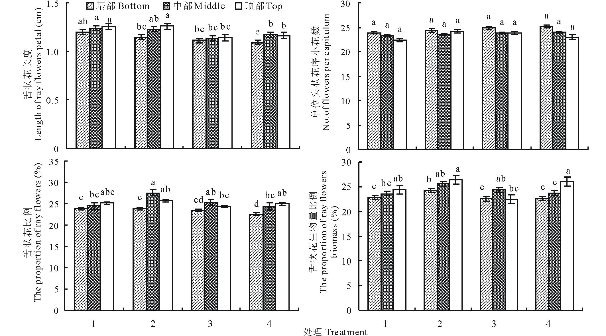 采用SPSS 16.0(SPSS Inc., Chicago, IL)进行统计分析。2010年的数据采用One-way ANOVA 分析方法检测3种橐吾的花序部位对舌状花长度、小花数、舌状花比例、舌状花生物量比例的影响。2011年的数据采用其中Three-way ANOVA分析方法检测3种橐吾的花序部位、植株高度、营养体叶片去除对舌状花长度、小花数、舌状花比例、舌状花生物量比例的影响。采用Tukey’ s检验分析平均值之间的差异性。