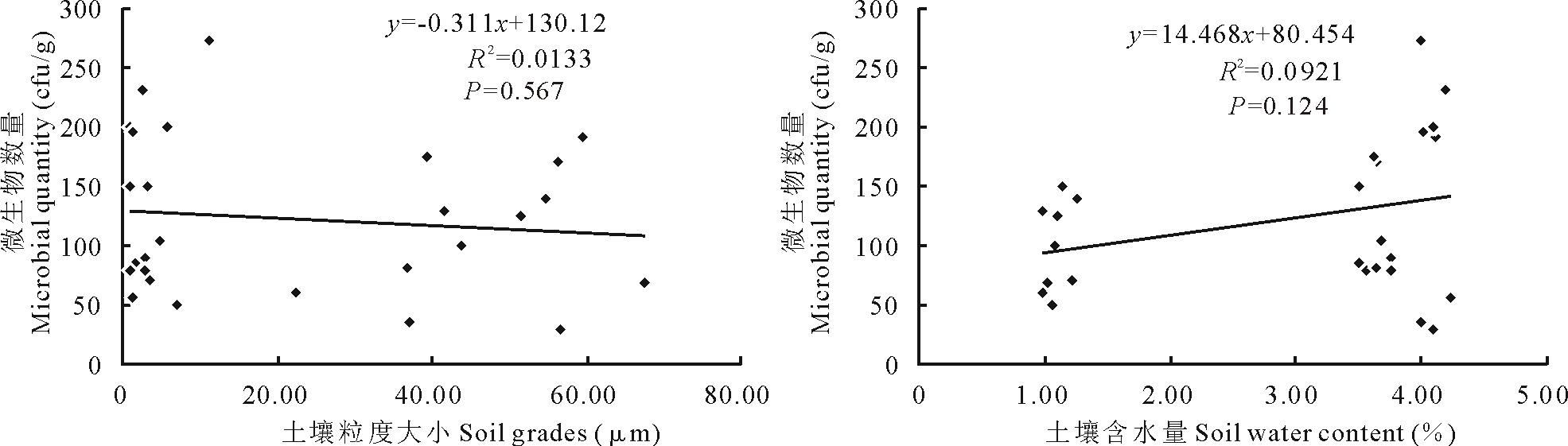 20年的人工梭梭林地, 土壤微生物数量随土壤粒度的增大而减小, 随土壤含水量增大而增加(图2), 但土壤微生物数量与土壤粒度大小、土壤含水量之间相关性不显著(P=0.567, P=0.124)。
