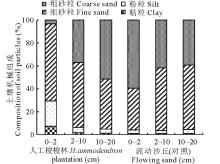 在研究区内选择20年人工梭梭林地和流动沙丘2种沙地类型, 对其土壤粒径进行对比分析。如图1所示, 2种沙地的土壤粒径分布有明显的不同, 人工梭梭林地主要以细砂粒为主(占56.1%), 流动沙丘以粗砂粒为主(占46.7%)。在土壤表层(0~2 cm)和2~10 cm, 粘粒、粉粒和细砂粒含量人工梭梭林地远高于流动沙丘, 梭梭林与流动沙丘土壤表层粘粒分别占7.5%, 1.0%, 粉粒占22.5%, 3.0%, 细砂粒占67.0%, 39.0%, 粗砂粒占3.0%, 57.0%。在垂直方向上, 随土层深度的增加, 人工梭梭林地粘粒、粉粒和细砂粒含量逐渐减小, 粗砂粒含量增加; 而流动沙丘粘粒和粉粒含量基本保持不变, 细砂粒含量逐渐增加, 粗砂粒含量减少。可以看出, 流动沙丘梭梭造林对土壤的形成作用非常明显。