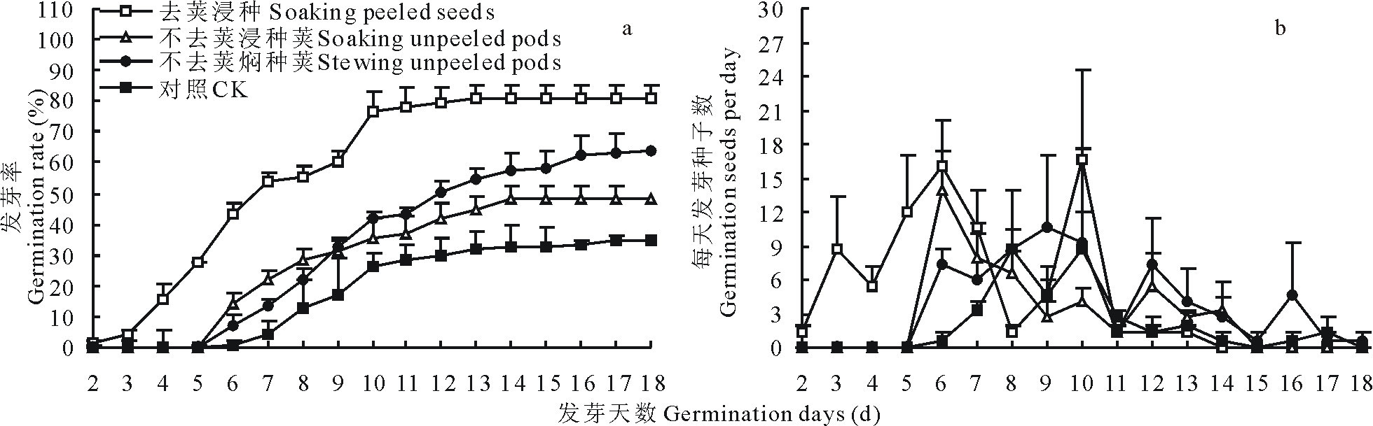 图1b还显示, 对照不处理干种荚置发芽床后在第6天3个重复百粒种子平均仅有1粒发芽, 而种子经去荚浸种、不去荚浸种和不去荚焖种荚12 h后分别已有16, 14和7粒种子发芽。显然, 与对照相比较, 预处理显著促进了红芪种子的发芽进程(图1)。其中, 对照种子从第6天开始发芽, 第17天发芽结束, 发芽持续期为12 d; 去荚浸种12 h后种子从第2天开始发芽, 第13天发芽结束, 发芽持续期为12 d; 不去荚浸种和不去荚焖种12 h后种子均从第6天开始发芽, 但前者第14天发芽结束, 发芽持续期为9 d, 后者第18天发芽结束, 发芽持续期为13 d。各处理发芽持续期最大相差4 d。在整个种子发芽过程中, 预处理明显提早了种子发芽高峰期, 经焖种处理的种子发芽持续期明显延长。