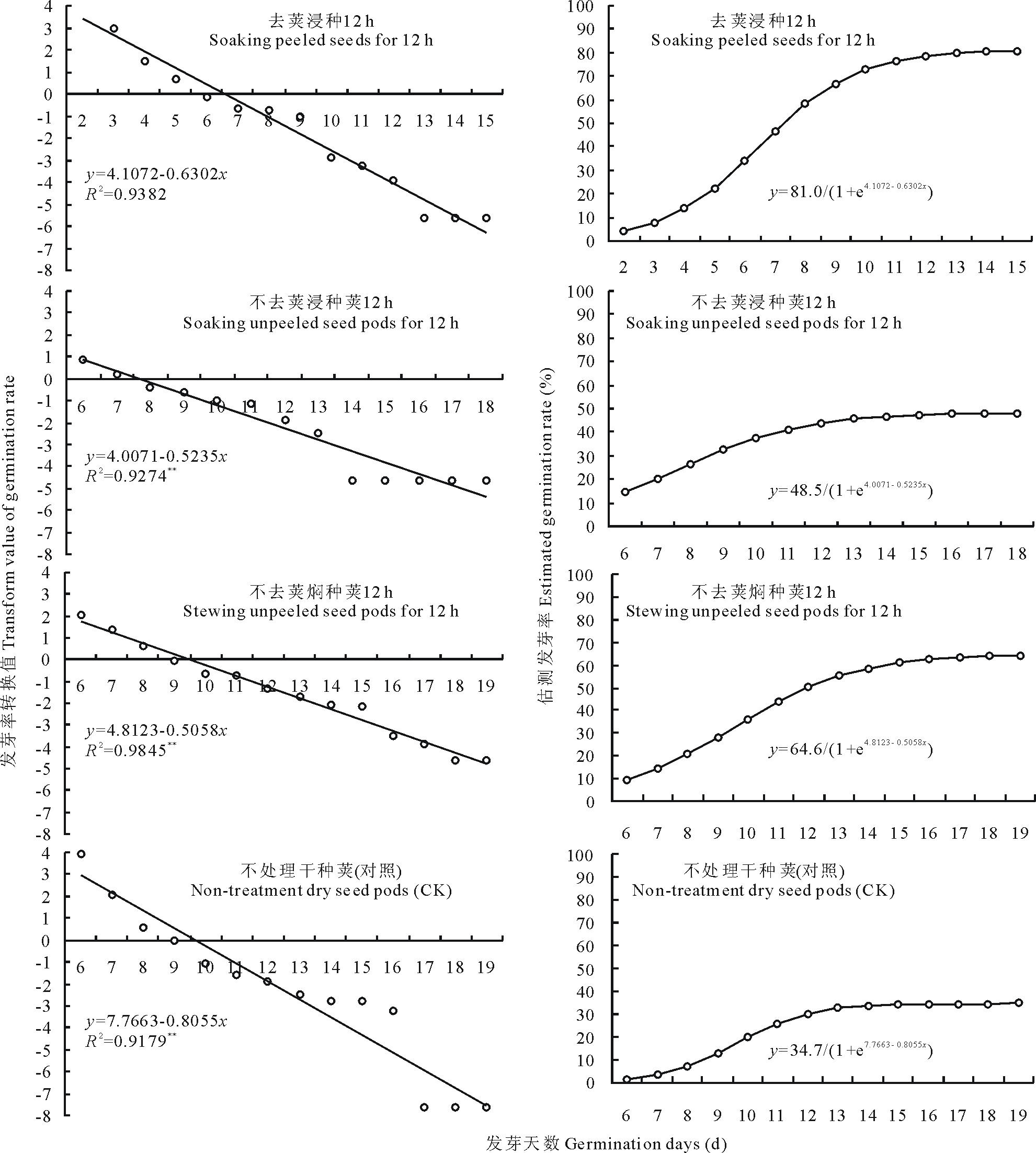 | 表1 种荚预处理后红芪种子发芽率随发芽天数的变化动态拟合Logistic方程的参数估计 Table 1 Parameter estimation based on Logistic equation fitting the dynamics of seed germination rate for H. polybotrys following pod pretreated with the germination days |