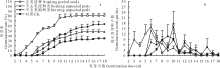 | 图1 种荚预处理12 h后红芪种子发芽率(a)和每天百粒种子发芽种子数(b)的动态变化过程Fig.1 Dynamics of seed germination rate (a) and the germinated seeds every day (b) in 100-seeds after pod pretreated for 12 h |