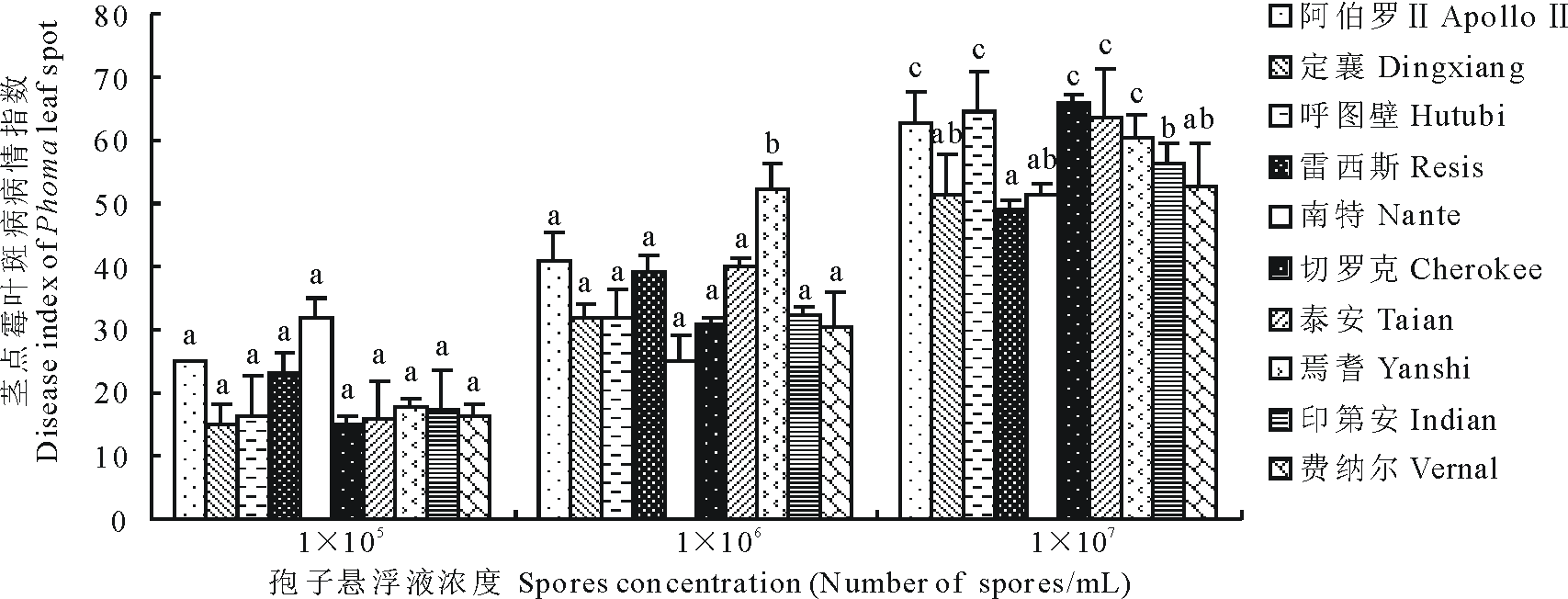随着孢子悬浮液浓度的升高, 各品种茎点霉叶斑病的病情指数也呈现升高的趋势(图2)。当孢子悬浮液浓度为1× 105个孢子/mL时, 10个品种茎点霉叶斑病的病情指数为14.93~21.33, 各材料间无显著差异; 当孢子悬浮液浓度为1× 106个孢子/mL时, 病情指数为20.00~39.20, 材料间存在显著差异(P< 0.05); 当孢子悬浮液浓度为1× 107个孢子/mL时, 病情指数为30.67~66.13, 材料间也存在显著差异(P< 0.05), 但该浓度下10个品种的病情指数也普遍较高, 均表现为高度感病, 不利于区分抗感材料。因此, 茎点霉叶斑病的适宜接种浓度为1× 106个孢子/mL。