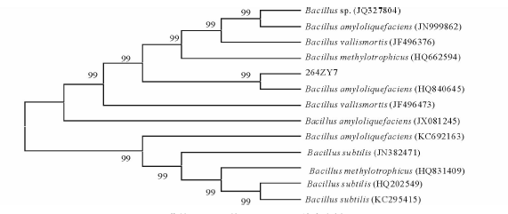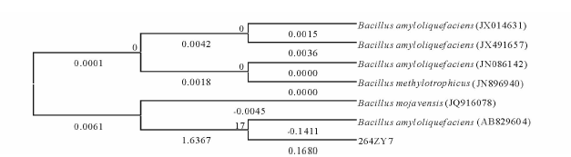 1) 16S rDNA序列鉴定。经测序得到菌株264ZY7的16S rDNA基因有1460个碱基, 其基因序列在GenBank中与已知序列进行Blast同源性比对, 结果表明, 264ZY7(KF831372)与已报道的解淀粉芽孢杆菌(Bacillus amyloliquefaciens)(HQ840645), 甲基营养型芽孢杆菌(Bacillus methylotrophicus)(HQ662594), 死谷芽孢杆菌(Bacillus vallismortis)(JF496473)和枯草芽孢杆菌(Bacillus subtilis)(JN382471)相似性均达99%, 经建立的系统发育树(图4), 拮抗菌株264ZY7与解淀粉芽孢杆菌(Bacillus amyloliquefaciens)(HQ840645)同源性较近, 初步将其鉴定为解淀粉芽孢杆菌Bacillus amyloliquefaciens。