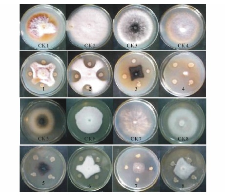 供试病原真菌:马铃薯炭疽病菌(Colletotrichum coccodes)、马铃薯枯萎病菌(Fusarium avenaceum)、小麦根腐病菌(Bipolaris sorokiniana)、孜然根腐病菌(Fusarium solani)、黄瓜枯萎病菌(Fusarium oxysporum)、番瓜根腐病菌(Fusarium sp.)、番茄灰霉病菌(Botrytis cinerea)和马铃薯褐腐病菌(Stysanus stemonitis)。