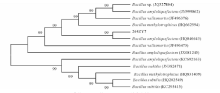 2) gyrB基因序列鉴定。由于细菌16S rDNA具有高度保守性[14], 在比较一些相似性比较高的近缘种时, gyrB基因更能准确的鉴定到种。拮抗菌株DNA的提取方法同1.4。以细菌gyrB基因扩增引物UP-1(5'-GAAGTCATCATGACCGTTCTGCATGCCGGTGGAAAGTTCGA-3')和引物UP-2(5'-AGCAGGGTACGGATGTGCGAGCCATCTACGTCAGCGTCAGTCAT-3')进行扩增[15]。扩增体系为10× PCR buffer 2.5 μ L, MgCl2(25 mol/L)2 μ L, dNTP(5 mmol/L)1 μ L, Taq酶(5 U/μ L)1 μ L, UP-1 1 μ L, UP-2 1 μ L, 模板DNA 1 μ L, ddH2O:15.5 μ L, 总体系为25 μ L。扩增条件:95℃预变性5 min; 94℃变性1 min, 55℃退火1 min, 72℃延伸2 min, 30个循环; 最后在72℃延伸10 min。