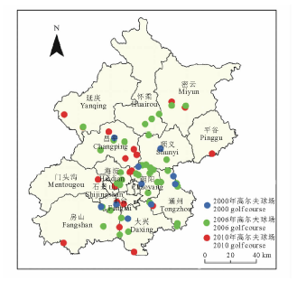 基于丰富的遥感影像数据源, 结合土地利用/土地覆盖数据和地理要素数据(道路、行政区划、水域等), 利用地理信息系统空间叠加分析、缓冲区分析和距离分析等功能, 可从时空角度分析北京市高尔夫球场时空变化特征, 总结球场时空变化规律。