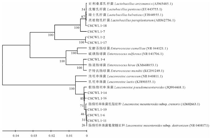 由表6可知, 菌株CSCWL 1-2和CSCWL 1-17在15℃条件下生长, 45℃条件下不生长, 能利用葡萄糖产酸产气, 可发酵果糖产酸, 水解精氨酸, 显微镜下为短杆状, 初步确定为异型发酵短乳杆菌(Lactobacillusbrevis)。菌株CSCWL 1-7和CSCWL 1-18能利用葡萄糖产酸但不产气, 可发酵阿拉伯糖、麦芽糖、果糖、半乳糖、乳糖、麦芽糖、甘露醇、甘露糖、蜜二糖、棉籽糖、蔗糖和纤维二糖产酸, 不能水解精氨酸, 初步确定为植物乳杆菌(Lactobacillusplantarum)。结合表5和6结果, 球状菌株CSCWL 1-4能在15℃、45℃、pH 9.6和6.5% NaCl条件下生长, 0.1%美兰还原试验为阳性, 精氨酸产氨, 利用葡萄糖产酸但不产气, 可发酵阿拉伯糖、果糖、半乳糖、蜜二糖、海藻糖、麦芽糖、纤维二糖和乳糖产酸, 不能发酵松三糖和山梨醇, 暂无法对其在种水平上进行判断。菌株CSCWL 1-6、CSCWL 1-11、CSCWL 1-14、CSCWL 1-16和CSCWL 1-19能利用葡萄糖产酸但不产气, 所以均为同型发酵乳酸菌, 不能发酵利用松三糖、鼠李糖和山梨醇, 精氨酸产氨试验为阴性, 符合明串珠菌属(Leuconostocaceae)的特征, 暂无法在种水平上做出判断。故菌株CSCWL 1-4、CSCWL 1-6、CSCWL 1-11、CSCWL 1-14、CSCWL 1-16和CSCWL 1-19的鉴定结果需要结合16S rRNA序列分析技术进行准确判断。