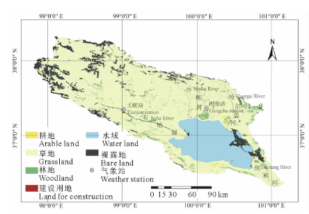 青海湖流域位于青藏高原的东北部(36° 15'-38° 20' N, 97° 50'-101° 20' E)(图1), 面积为29661 km2, 海拔3194~5174 m, 属于典型的干旱半干旱气候区。流域内年平均温度范围为-0.8~1.1℃, 年降水量范围为324.5~412.8 mm, 呈现由东北向西南降低的趋势。地势西北高而东南低, 地貌类型复杂, 多高山分布, 山区面积占流域总量的68.6%。该区域内的青海湖是我国最大的内陆湖泊, 也是最大的咸水湖, 湖泊覆盖面积约占流域总面积的16.0%以上, 注入青海湖的主要河流有布哈河、沙柳河、哈尔盖河、黑马河和倒淌河, 其中布哈河是注入青海湖最大的河流, 占流域内年总径流量的48.8%[19]。流域内土地覆盖类型多样, 草地、灌丛、荒漠、水域及农田都有分布, 其中草地是流域主要覆盖类型, 约占流域面积的70%(图1)。