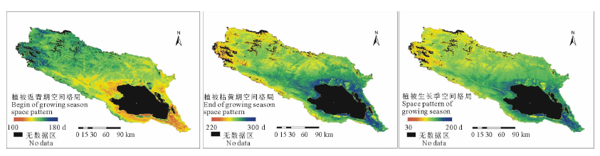1)2000-2014年期间, 青海湖流域内植被陆续进入返青阶段集中在4月中旬-6月中旬, 历时约60 d。植被返青时间在流域整体空间上呈现由东南向西北延迟的水平地带性变化格局, 多高山分布区域的植被进入返青期时间表现出垂直非地带性。植被陆续进入枯黄阶段在8月中旬-10月中旬, 历时约60 d, 进入枯黄期时间在空间格局上与返青空间格局扩展趋势相反。流域内植被平均生长季为124.6 d, 生长季长度集中分布在100~150 d之间, 空间格局与返青期、枯黄期空间格局一致。