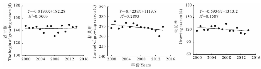 式中, n是研究期总年数; y为研究期中第y年; Py为第y年的物候数据; Yn为研究期末年; Y1为研究期第1年; T为物候期的变化量。T> 0, 说明物候期延迟(延长); T< 0, 说明物候期提前(缩短)。