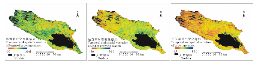 | 图4 青海湖流域植被物候时空动态变化空间格局(2000-2014年)Fig 4 Spatio-temporal variation of vegetation phenology in Qinghai Lake watershed during 2000 to 2014 |