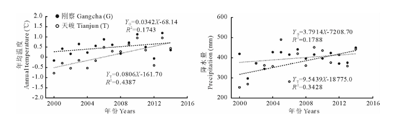 根据图5所示, 2000-2014年期间, 刚察、天峻2个气象站年均温度、降水量都呈明显增加趋势, 且天峻气象站观测的气候变化趋势较刚察气象站更显著, 变化速率均值分别为0.57℃/10年和66.68 mm/10年, 气候变化暖湿趋势明显, 与整个青藏高原气候变化趋势一致[23]。在暖湿的气候变化趋势下, 流域植被平均返青期变化趋势并不明显, 且仅与年降水量具有弱负相关性, 相关性系数分别为0.1303和0.2140, 与气象站年均温度无相关性, 说明青海湖流域年均温度升高背景下流域内植被平均返青期并未表现出提前趋势。流域植被平均枯黄期与天峻年均温度具有负弱相关性(R2=0.3091), 与刚察(R2=0.1626)、天峻年降水量(R2=0.2382)具有负相关性, 说明年降水量在一定程度上影响着流域植被枯黄期。植被平均生长季与天峻气象站温度(R2=0.2280)、降水量(R2=0.1381)具有弱负相关性, 相关性明显优于刚察。