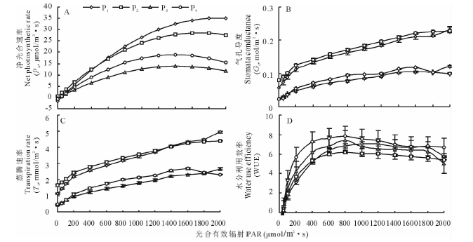 4个居群的WUE随PAR的增大呈先上升后下降的趋势, 在PAR达到800 μ mol/(m2· s)时WUE达到最大值(图1D), 4个居群的WUE差异显著(P< 0.05), 大小顺序为:P4> P3> P1> P2, 说明居群P4的水分利用效率最高。