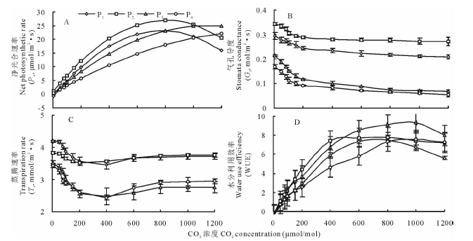 2.2.3 蒸腾速率(Tr)和水分利用率(WUE)的变化 随着CO2浓度的升高, 4个居群的Tr变化趋势一致(图2C)。居群P3、P4的Tr明显高于居群P1、P2, 在CO2浓度为0~600 μ mol/mol, 各居群的蒸腾速率均呈下降趋势, CO2浓度大于600 μ mol/mol时, 各居群的蒸腾速率逐渐增大。