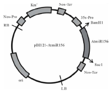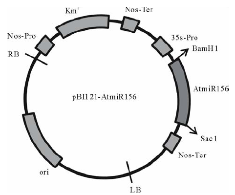 转化所用的载体为pBI121-AtmiR156过量表达载体(图1), 农杆菌菌株为GV3101, 将保存的菌种在抗性平皿(LB+50 mg/L Gent+50 mg/L Km, LB配方:酵母提取物5 g/L, 胰蛋白胨10 g/L, 氯化钠10 g/L)上划线活化, 28 ℃培养3 d, 挑取活化的含有目标质粒的农杆菌单菌落到5 mL LB+25 mg/L Gent+50 mg/L Km的液体培养基, 28 ℃, 220 r/min摇床上活化24 h。按照1:50的比例将活化的菌液接种到50 mL LB+25 mg/L Gent+50 mg/L Km的培养基中, 28 ℃, 220 r/min转速下培养8~16 h, 至菌液OD600=0.8。 取 20 mL新鲜培养的菌液, 室温5000 r/min 离心15 min。弃上清, 加入20 mL DM培养基, 用5 mL移液器轻轻将农杆菌菌体悬浮于DM培养基里。去上清, 用20 mL DM重新悬浮一次, 取2 mL悬浮菌液稀释到20 mL DM培养基中, 农杆菌准备完成, 在2 h内使用效果不受影响。