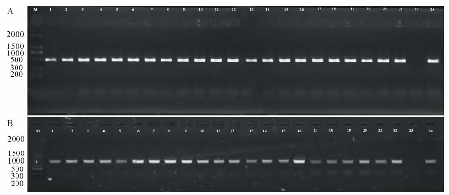 采用检测抗性标记的方法PCR扩增140个转基因菊苣抗性标记NPT基因。并进行电泳分离, 结果显示132个单株(94.3%)能够扩增出目的条带, 大小与阳性对照(以pBI121质粒为模板)相同, 而阴性对照(以非转基因菊苣为模板)则无扩增, 表明转化材料中已经含有外源基因DNA片段(图4A), 随机挑选22株阳性转基因植株, 与阳性对照(pBI121-AtmiR156)和阴性对照(非转基因植株)一起, 利用35S+AtmiR156R进行检测扩增, 所有挑选的植株都能扩增出目标条带(图4B)。