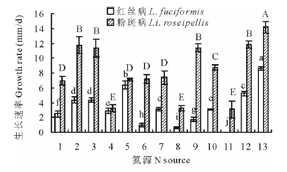 在供试的12种氮源中, 以L-谷氨酰胺为氮源的培养基最适合红丝病病原菌的生长, 其次是磷酸氢二氨, 红丝病病原菌在以乙酸铵为氮源的培养基上不生长。粉斑病病原菌对L-谷氨酰胺利用率最高, 其次为硝酸钠、硝酸钾、蛋白胨、L-亮氨酸, 而对磷酸二氢铵、甘氨酸、乙酸铵的利用率较低(图2)。