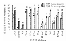 红丝病病原菌在燕麦片煎液琼脂培养基(OMA)上生长速率最快, 其次为马铃薯蔗糖琼脂培养基(PSA), 而在查彼固体培养基(Czapek)和营养牛肉琼脂培养基(NA)上的生长速率最慢。粉斑病病原菌在马铃薯蔗糖琼脂培养基(PSA)和马铃薯葡萄糖琼脂培养基(PDA)上生长速率最快, 其次为燕麦片煎液琼脂培养基(OMA)、马铃薯胡萝卜煎液培养基(PCA), 而在查彼固体培养基 (Czapek)、理查固体培养基(Richard)、海水营养琼脂培养基(SNA)这类用无机元素配制的培养基上生长速率较慢, 在营养牛肉琼脂培养基(NA)上的生长速率最慢(图3)。