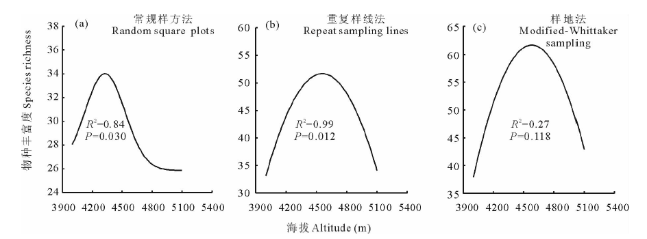在3种不同取样方法下, 山地灌丛草地植物群落α 多样性(物种丰富度)均随海拔的升高呈"单峰曲线"变化特征(图2). 常规样方法(图2a)在海拔4300 m 处物种数最多(34), 在5100 m处最少(25); 重复样线法(图2b)在海拔4600 m 处物种数最多(54), 在4000 m处最少(34); Modified-Whittaker样地法(图2c)在海拔4900 m 处物种数最多(62), 在4000 和5100 m处最少(39).从物种丰富度最大值来看, Modified-Whittaker样地法> 重复样线法> 常规样方法.从拟合效果(R2)来看, 重复样线法> 常规样方法> Modified-Whittaker样地法.综合考虑, 本研究推荐50 m样线重复3次可较好地反映这一地区山地灌丛草地物种的α 多样性.