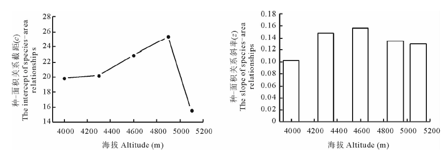 种-面积关系截距c随海拔的升高呈先升高后降低的趋势, 海拔5100 m处c值最小(15.601), 海拔4900 m处c值最大(25.401).这表明截距c表征的α 多样性亦呈"单峰曲线"分布特征, 与物种丰富度的分布特征相吻合.随海拔的升高种-面积关系斜率z亦呈先增加后降低的趋势, 表明β 多样性随海拔的升高呈先增加后降低的趋势.海拔4000 m处z值最小(0.103), 海拔4600 m处z值最大(0.157), 表明斜率z表征的β 多样性在低海拔处最小, 中海拔处最大.这可能是因为低海拔处生境差异性较高, 物种组成差异较大; 中海拔处生境较为均一, 物种组成差异较小(图3).