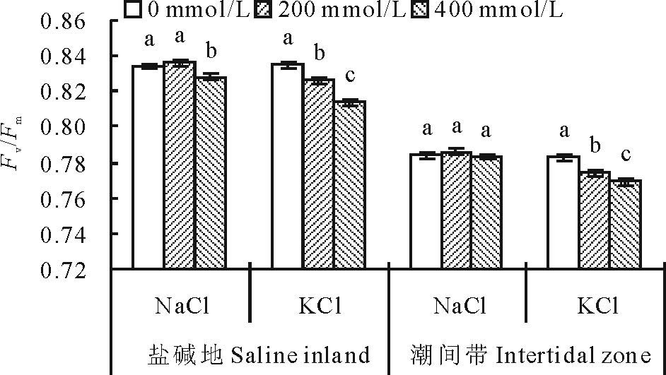 由图6可知, 潮间带种源碱蓬叶片Fv/Fm值极显著低于盐碱地, 所有处理平均低5.9%。从盐分处理来看, NaCl处理对两种生境碱蓬叶片Fv/Fm值均无显著影响, 但KCl处理则使碱蓬叶片Fv/Fm值呈降低趋势, 其中200 mmol/L的KCl处理使盐碱地和潮间带种源的碱蓬叶片Fv/Fm值比对照分别显著降低1.2%和1.1%, 400 mmol/L的KCl处理比对照分别显著降低2.5%和1.8%。