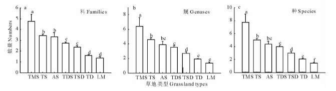 单因素方差分析结果显示, 温性草甸草原拥有最多的科, 平均为4.77个, 远高于其他草地类型(P< 0.05); 温性草原和高寒草原科数量分别为3.43和3.33个, 与其他草地之间均有显著差异; 温性荒漠草原(2.75个)和温性草原化荒漠(2.37个), 数量相当; 温性荒漠和低平地草甸的科最少, 分别为1.60和1.35, 均显著低于其他草地类型(图4a)。