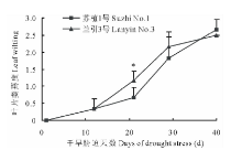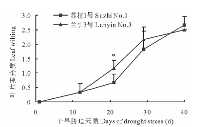 如图1所示, 干旱胁迫第12天, ‘ 苏植1号’ 和‘ 兰引3号’ 都开始出现萎蔫, 胁迫第29天, 两个品种均达到中度萎蔫, 至胁迫第40天, 两个品种的叶片萎蔫度分别为2.7和2.5, 均接近重度萎蔫, 整个处理期间, 除胁迫第21天外, 在胁迫第1, 12, 29, 40天, 品种间的叶片萎蔫度均没有显著差异, 表明在本次试验条件下, 干旱胁迫对两个品种的叶片外观具有近似的影响。