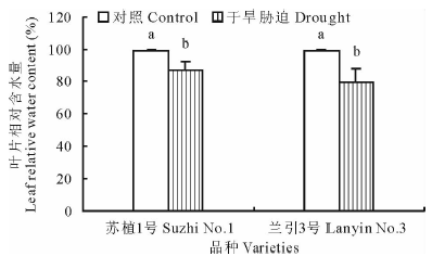 如图2所示, 干旱胁迫第40天, ‘ 苏植1号’ 和‘ 兰引3号’ 的叶片相对含水量均显著下降, 分别为各自对照的87.2%和80.0%, ‘ 苏植1号’ 下降幅度略小于‘ 兰引3号’ , 但品种间的差异未达显著水平, 说明干旱胁迫结束时两个品种具有近似的内部水分状况。