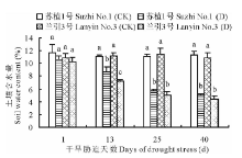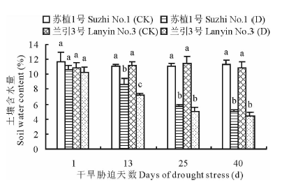 如图4所示, 随干旱胁迫程度加重, ‘ 苏植1号’ 和‘ 兰引3号’ 的土壤含水量呈逐渐下降趋势, 至胁迫第13天, 两个品种均显著低于各自对照, 同时‘ 苏植1号’ 明显高于‘ 兰引3号’ , 至胁迫第25, 40天, 品种间不再具有显著差异, 胁迫第40天时, ‘ 苏植1号’ 和‘ 兰引3号’ 的土壤含水量分别为各自对照的44.2%和40.5%, 以上情况表明, 在处理前期, ‘ 苏植1号’ 土壤含水量的下降程度低于‘ 兰引3号’ , 至处理中后期, 两个品种的下降程度相同, 但就整个干旱胁迫过程而言, 两个品种的土壤含水量总体上具有类似的变化趋势。