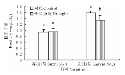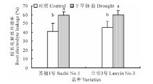 2.5.1 根系干重 如图5所示, 在对照条件下, ‘ 苏植1号’ 的根系干重显著低于‘ 兰引3号’ , 说明两个品种间本身存在遗传差异; 同时在干旱胁迫第40天, ‘ 苏植1号’ 和‘ 兰引3号’ 的根系干重分别为对照的101.0%和84.3%, ‘ 苏植1号’ 与对照无显著差异, 而‘ 兰引3号’ 则显著低于对照, 表明干旱胁迫对‘ 苏植1号’ 的根系生物量没有影响, 却使‘ 兰引3号’ 的根系生物量明显下降。尽管如此, ‘ 兰引3号’ 在干旱胁迫下仍然具有显著大于‘ 苏植1号’ 的根系生物量。