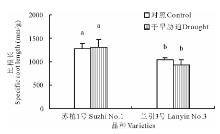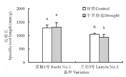 2.5.2 比根长 如图6所示, 在对照条件下, ‘ 苏植1号’ 的比根长显著高于‘ 兰引3号’ , 这是由于两个品种间本身存在遗传差异; 干旱胁迫第40天, ‘ 苏植1号’ 和‘ 兰引3号’ 的比根长分别为各自对照的102.1%和89.2%, 两个品种与各自对照的差异均不显著, 表明干旱胁迫对‘ 苏植1号’ 和‘ 兰引3号’ 各自的比根长没有明显的影响。