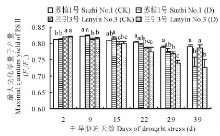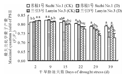 如图7所示, 干旱胁迫下随着胁迫天数增加, ‘ 苏植1号’ 和‘ 兰引3号’ 的最大光化学量子产量(Fv/Fm)呈逐渐下降趋势, 虽然在干旱胁迫第2天, ‘ 苏植1号’ 低于‘ 兰引3号’ , 但是在干旱胁迫中期(胁迫第9, 15, 22, 29天), ‘ 苏植1号’ 却持续高于‘ 兰引3号’ , 品种间的差异达到显著水平, 至胁迫第29天, ‘ 兰引3号’ 的Fv/Fm值开始显著低于其对照, 而‘ 苏植1号’ 此时仍维持在对照水平, 直至胁迫第39天, 两个品种的Fv/Fm值均显著低于各自对照, ‘ 苏植1号’ 和‘ 兰引3号’ 分别为各自对照的92.4%和92.3%, 品种间不再具有显著差异, 以上情况表明, 在干旱胁迫中期, ‘ 苏植1号’ 能够维持比‘ 兰引3号’ 更高的PSⅡ 光能转换效率。