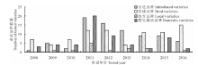截止2015年, 国家草品种区域试验参试材料共231份(数据来源于http://www.digitalgrass.cn/), 其中育成品种共83个, 引进品种79个, 野生栽培品种56个, 地方品种13个。从科分类看, 禾本科有54个种, 118个品种, 占参试材料51.08%; 豆科有32个种, 98个品种, 占参试材料总数的42.42%; 其余主要是菊科、蓝雪科、蓼科、满江红科、蔷薇科、十字花科、旋花科、荨麻科、鸢尾科等9个科; 从属种分类看, 主要是苜蓿属、黑麦草属、高粱属、鸭茅属、三叶草属(Triflolium)、小黑麦属、披碱草属、狗牙根属、羊茅属等80个属97个种, 基本覆盖主要牧草属种。从历年国家草品种区域试验参试品种类别来看, 育成品种参试比例基本呈现逐年增加趋势, 从最低的18.08%增加到最高的62.5%; 引进品种参试比例下降到25%; 地方品种比例最高不超过9%; 野生栽培品种比例最高不超过3.57%(图1)。申报品种现阶段以育成品种和引进品种为主, 说明育成品种的主体地位越来越突显。