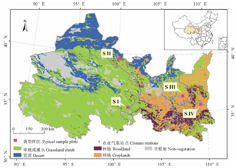 1.2.4 典型作物样区数据 根据研究区作物种植特点, 分别选取资料记录较为完整, 且具有典型代表性的青海河南SⅠ (牧草)、甘肃张掖SⅡ (春小麦+玉米)、甘肃西峰SⅢ (冬小麦+玉米)和陕西蒲城SⅣ (冬小麦)4个农业气象台站资料作为本研究结果的验证数据。与此同时, 为了尽量避免混合像元等不确定性因素对验证结果的影响, 本研究利用地面实测资料和Landsat8 OLI高分辨率资料, 选取了台站附近地势较为平坦、耕地分布均匀, 种植作物类型与台站记录相同、且种植面积大于5 km× 5 km的下垫面作为典型样区(图1)。