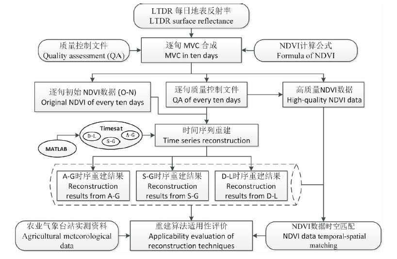 结合数据自带的质量控制文件(quality assessment, QA), 根据MVC合成法[26], 将每日LTDR NDVI合成初始逐旬NDVI数据, 并生成相应时期的QA文件。QA文件是在像元尺度上能够综合评价和反映该时段遥感数据质量信息的资料。