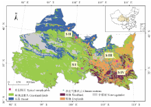 本研究以地处干旱区和半干旱区过渡带的我国西北地区东部省份作为研究区。该地区介于 32° 44'11″ N-44° 07'24″ N、 88° 47'17″ E-112° 43'00″ E 之间, 面积为1.48× 106 km2, 约占我国陆地总面积的1/6。我国西北地区东部幅员辽阔, 自然条件恶劣、生态环境较为脆弱, 以山区降水和冰川融水补给为主, 年降水量空间分布极不均匀, 从南部450 mm以上过渡到北部沙漠地带的50 mm以下, 耕地灌溉主要依靠自然降水。特殊的地理位置和水热气候条件, 造成研究区自然植被空间分布差异较大, 形成了由西南草地到东北荒漠逐渐倾斜过渡的自然植被空间分布特征(图1)。尤其是自20世纪70年代中期全球变暖加剧以来, 该地区气候条件复杂多样, 极端水文事件增加, 地表植被覆盖对环境变化敏感。因此, 建立高质量、长时序的NDVI数据集, 为准确监测该地区的植被生长状况, 了解气候变化对植被的影响, 维护干旱半干旱区生态系统的稳定具有重要指导意义。