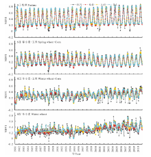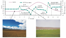 1.2.3 气象数据 通过中国气象科学数据共享服务网(http://cdc.nmic.cn), 下载了研究区101个农业气象站在1992-2010年的逐旬资料。资料主要包括种植作物名称、发育期名称、发育期时间、发育程度等观测指标。经初步统计分析表明, 研究区主要种植作物分为4种类型, 分别是牧草、冬小麦(Triticum aestivum)、冬小麦+其他种植作物[玉米(Zea mays)、马铃薯(Solanum tuberosum)等]、春小麦(Triticum aestivum)+其他种植作物(玉米、一季稻等)。